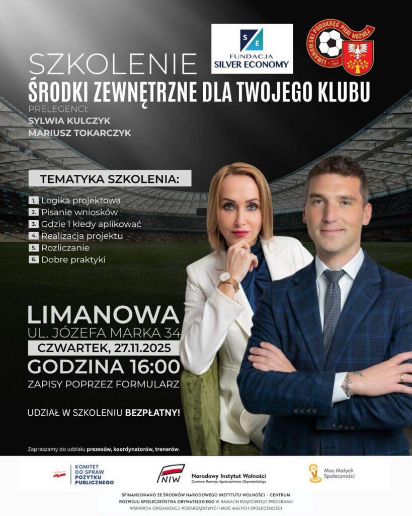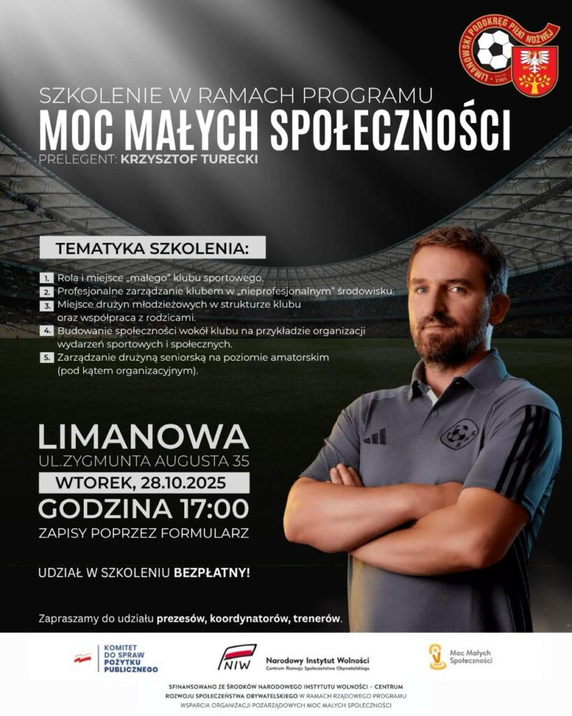W dniu 30 listopada 2025 r. Stowarzyszenie Limanowskiego Podokręgu zakończyło realizację projektu „Jesienna Liga Orlików – Integracja i Aktywność przez Piłkę Nożną”, współfinansowanego przez Narodowy Instytut Wolności – Centrum Rozwoju Społeczeństwa Obywatelskiego ze środków Rządowego Programu wsparcia organizacji pozarządowych „Moc Małych Społeczności”.
